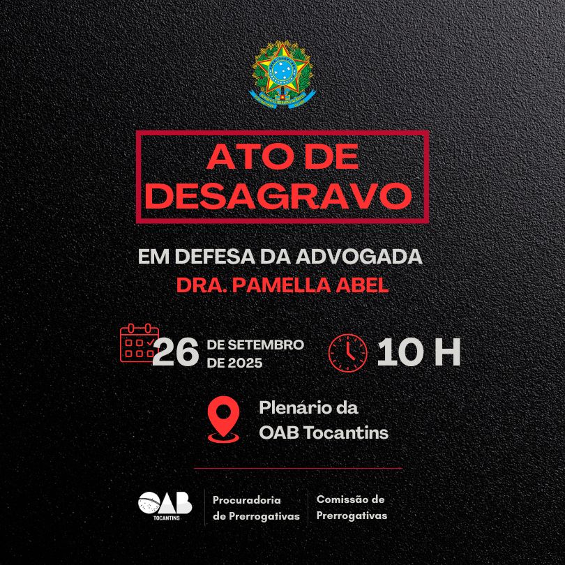 A Ordem dos Advogados do Brasil – Seccional Tocantins (OAB/TO) promoveu nesta sexta-feira (26), no plenário da entidade, um Ato de Desagravo Público em defesa da advogada Pamella Abel....